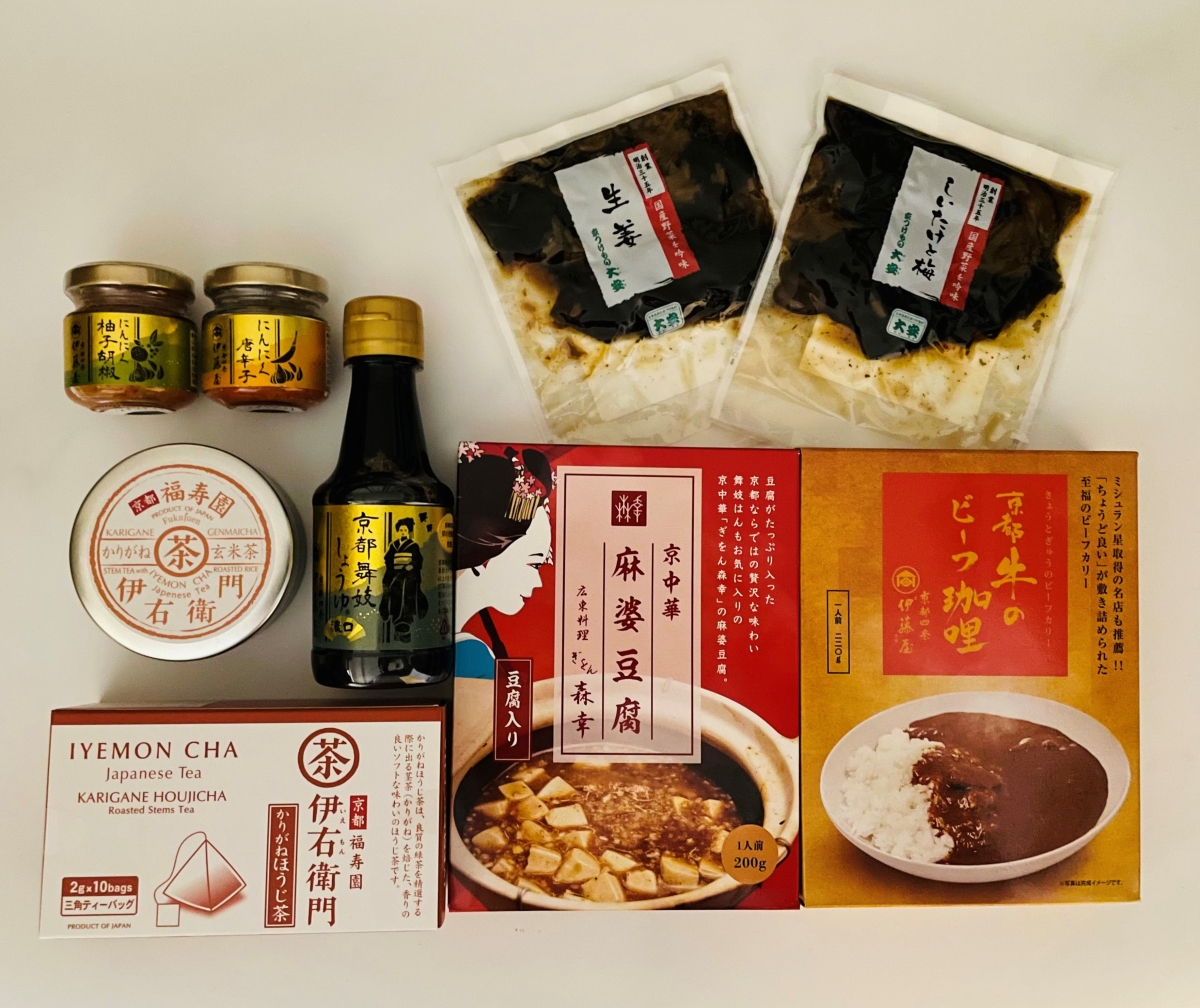 | 内容量 | 京都四条伊藤屋 京都牛のビーフ珈哩 × 1 ぎをん森幸 京中華 麻婆豆腐 × 1 京都四条伊藤屋 にんにく唐辛子 × 1 京都四条伊藤屋 にんにく柚子胡椒 × 1 京つけもの大安 おこぶ生姜 × 1 京つけもの大安 おこぶしいたけと梅 × 1 福寿園 伊右衛門かりがねほうじ茶 ティーバッグ ×1 福寿園 伊右衛門 かりがね玄米茶 平缶 × 1 小山醸造 京都舞妓しょうゆ 濃口 × 1 |